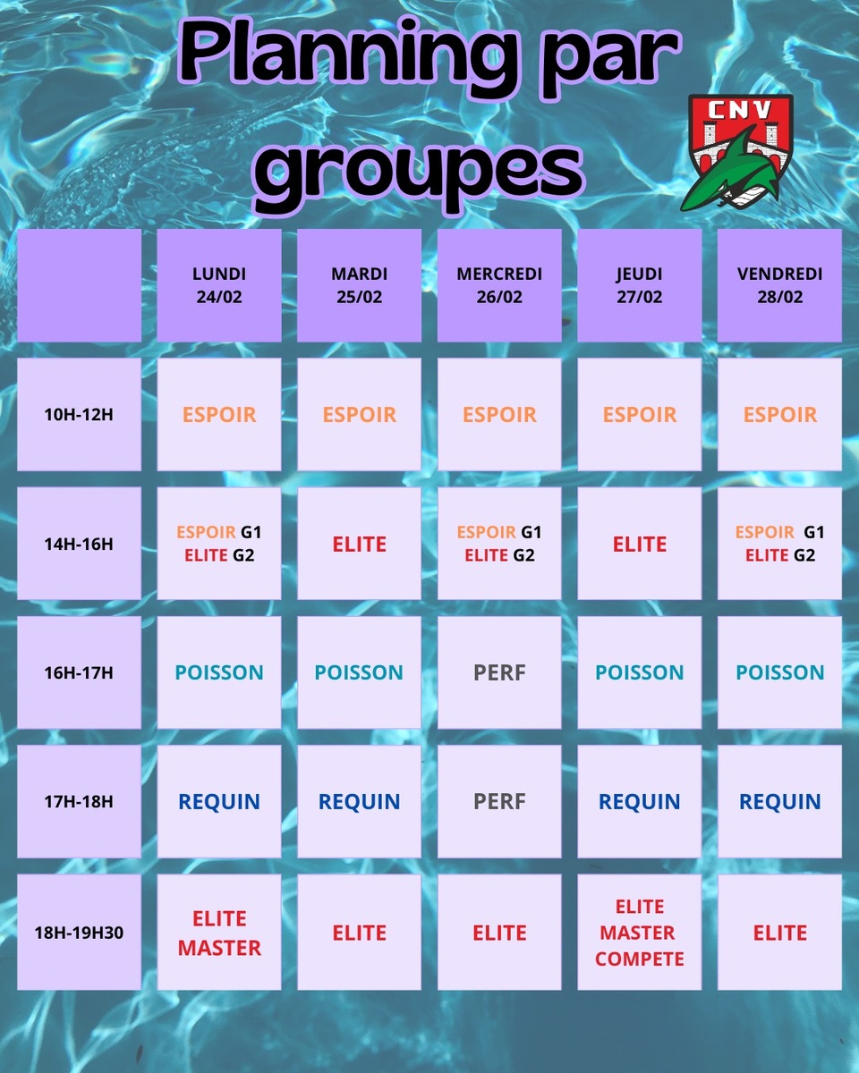 Vous pourrez prendre connaissance du planning pour l’ensemble des groupes, qui concerne l’intégralité des groupes du club (compétiteurs et école de natation).