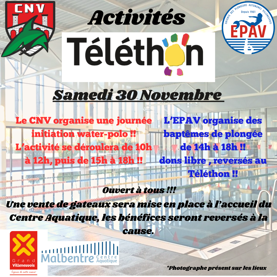 Le CNV et l’EPAV ont le plaisir de vous proposer diverses animations au sein du centre aquatique de malbentre, le samedi 30 Novembre,